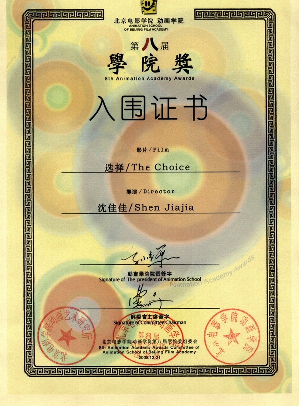 2008年沈佳佳动画作品《选择》入围第八届北京电影学院学院奖