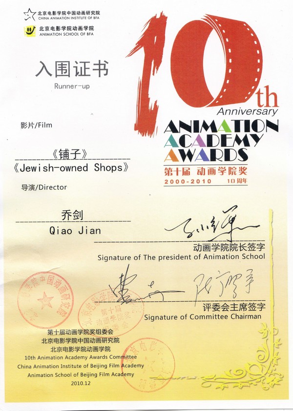 2011年乔剑动画作品《铺子》获得教育部高职高专艺术设计教学指导委员会第六届优秀毕业设计作品展金奖