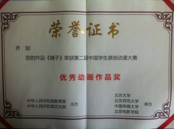 2011年乔剑动画作品《铺子》入围首届大学生绿色网络游戏动漫设计大赛二等奖