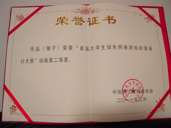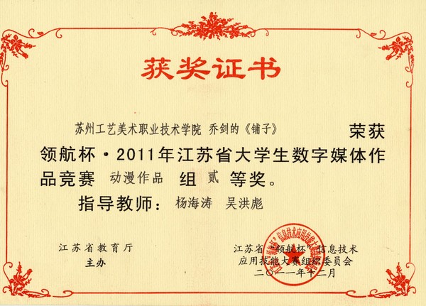 2011年乔剑《铺子》获得领航杯江苏省大学生数字媒体作品竞赛二等奖