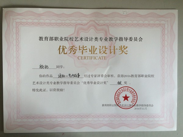 获得2016教育部职业院校艺术设计类专业教学指导委员会“优秀毕业设计奖”银奖