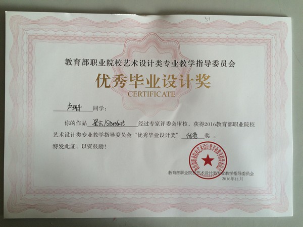 获得2016教育部职业院校艺术设计类专业教学指导委员会“优秀毕业设计奖”优秀奖